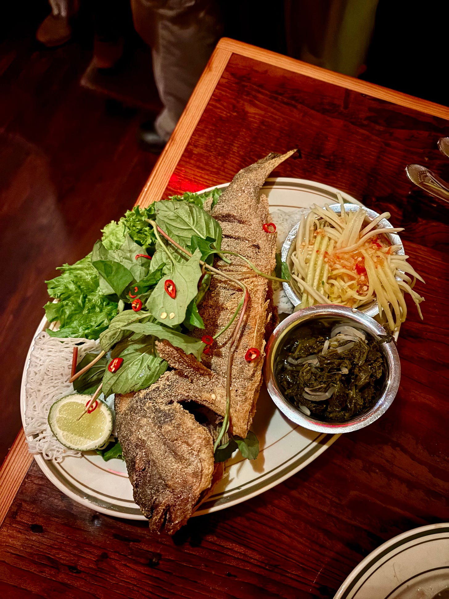 Fried Fish (Whole fish with 10 out of 10 ground lime seasoning, buttery and fun to eat with the rice noodles in the formation of a taco.)